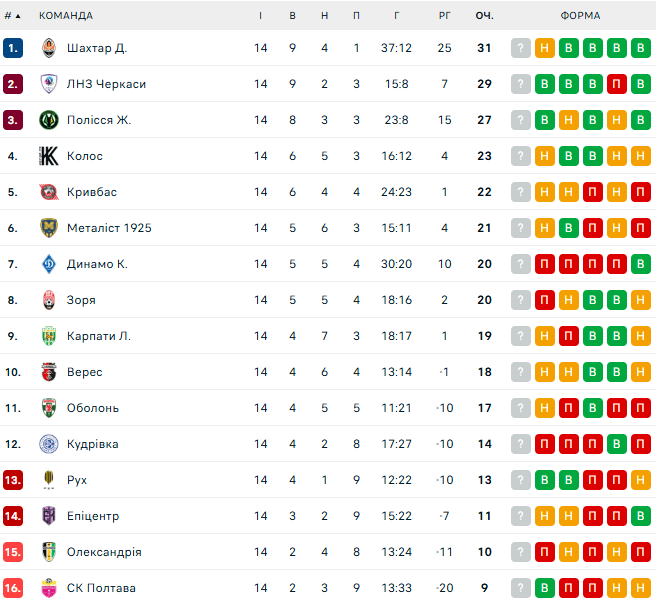 Таблица УПЛ после 14-го тура / © flashscore.ua