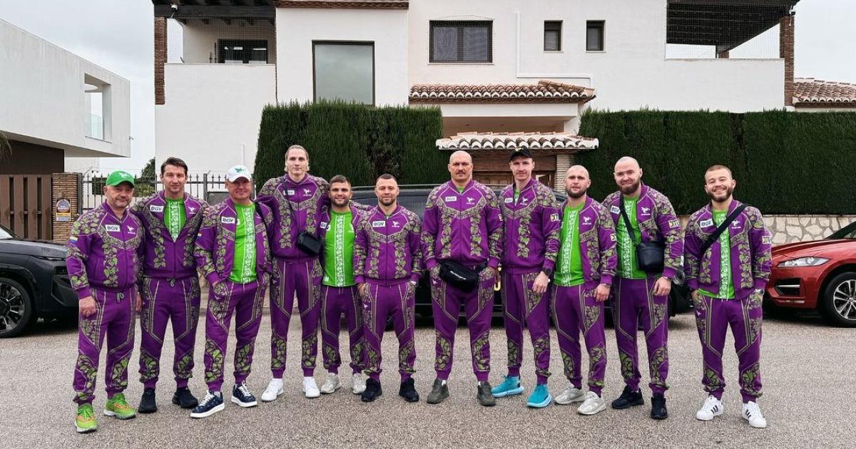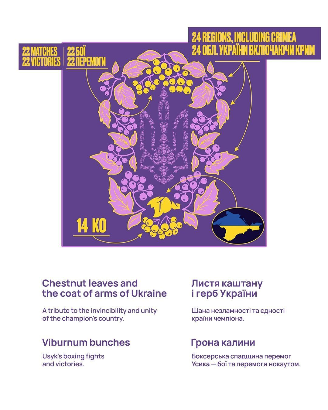 Отметим, что вся команда Усика прибыла в Эр-Рияд в одинаковых костюмах фиолетового цвета. На них изображены отсылки к Украине, боксерской карьере Александра, а также родному для него Крыму.