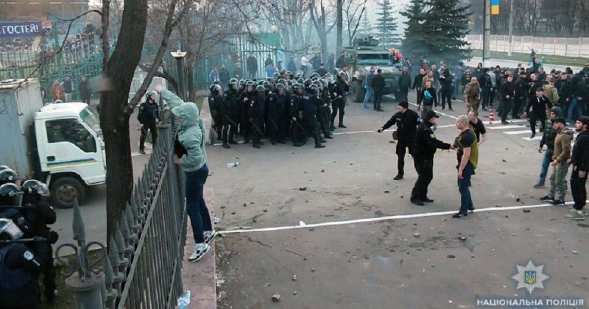 Конфликт между правоохранителями и болельщиками произошел во время второго тайма матча “Мариуполь” - “Динамо”. В полиции отмечают, что футбольные фанаты зажгли дымовые шашки и применили петарды, и правоохранители вывели нарушителей за пределы стадиона. Однако другие болельщики стали на их защиту, выбежали со стадиона и начали бросать в сторону правоохранителей и служебный автотранспорт камни.