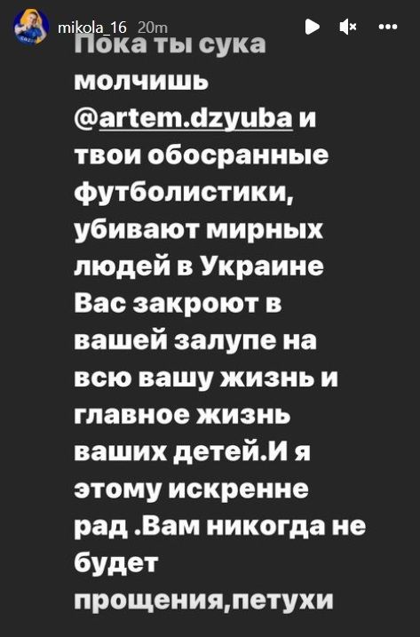 "Пока ты, сука, молчишь, Артем Дзюба и твои обосранные футболистики, убивают мирных людей в Украине. Вас закроют в вашей залупе на всю вашу жизнь и, главное, жизнь ваших детей. И я этому искренне рад. Вам никогда не будет прощения, петухи", - написал Миколенко в сторис Instagram.