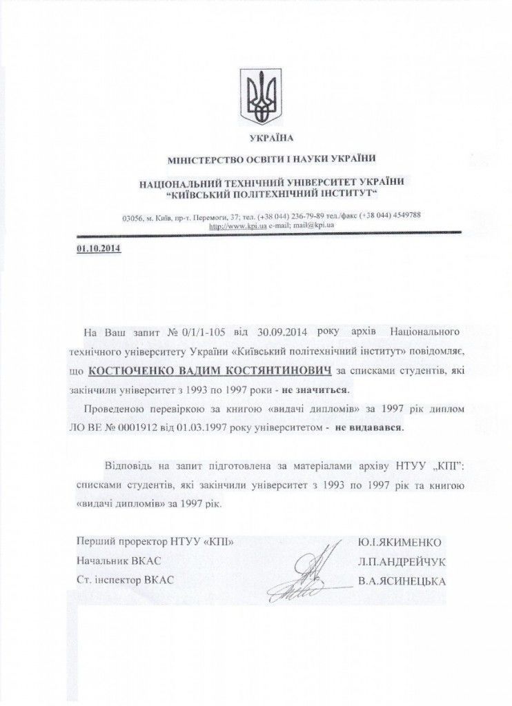 Тогда прокуратура проверяла подлинность его диплома Киевского политехнического института (КПИ). В официальном ответе учебного заведения на запрос указывалось, что такой студент не обучался в данном вузе.