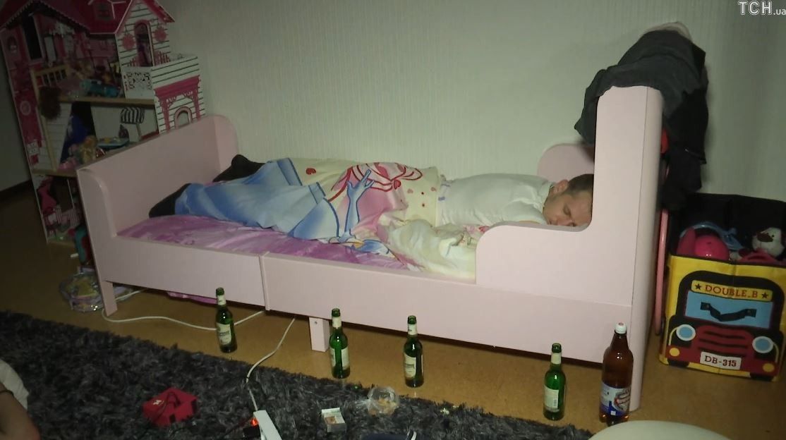 Александр и Татьяна Алиевы разведены более четырех месяцев, но продолжают жить под одной крышей. Татьяна спит в одной комнате с маленькими детьми, а Александр расположился в детской. Именно там, спящим в детской кровати, и застала футболиста съемочная группа ТСН около полвосьмого вечера. На полу рядом с кроватью были бутылки из-под пива, сигареты, а также спящий друг Алиева. Крепкий сон не нарушали ни громкая музыка, ни посторонние люди в квартире.