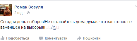 "Сегодня день выборов. Не оставайтесь дома, думая, что ваш голос не важен. Все на выборы!" – написал Зозуля.