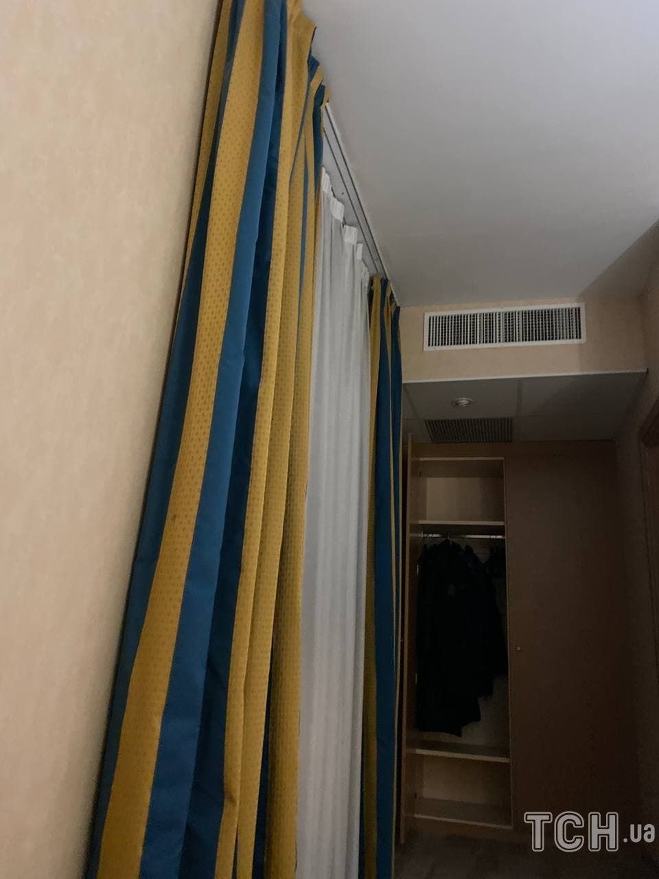 В номере гостиницы в Милане желто-голубые шторы