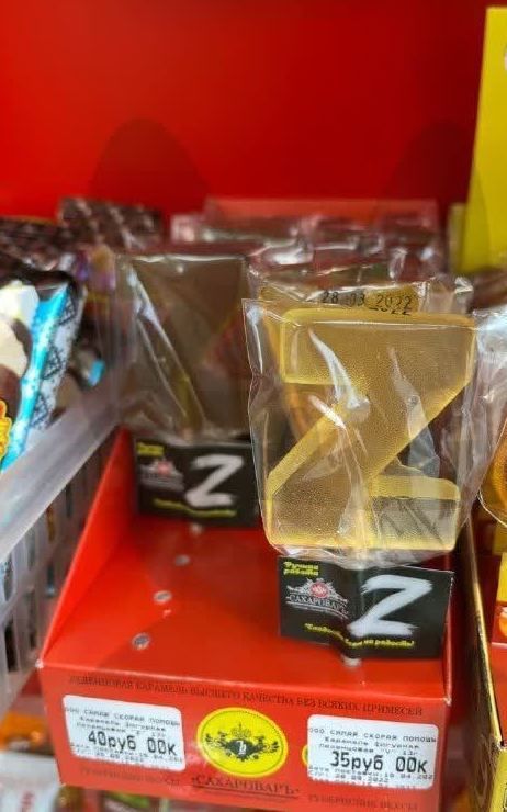 Пососать Z стоит 40 рублей. Также можно купить леденец в форме латинской буквы V, которой российские убийцы обозначают свою технику на войне против Украины. Он почему-то чуть дешевле – 35 рублей.