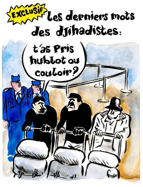 На карикатурах изображены террористы и последствия взрыва.
