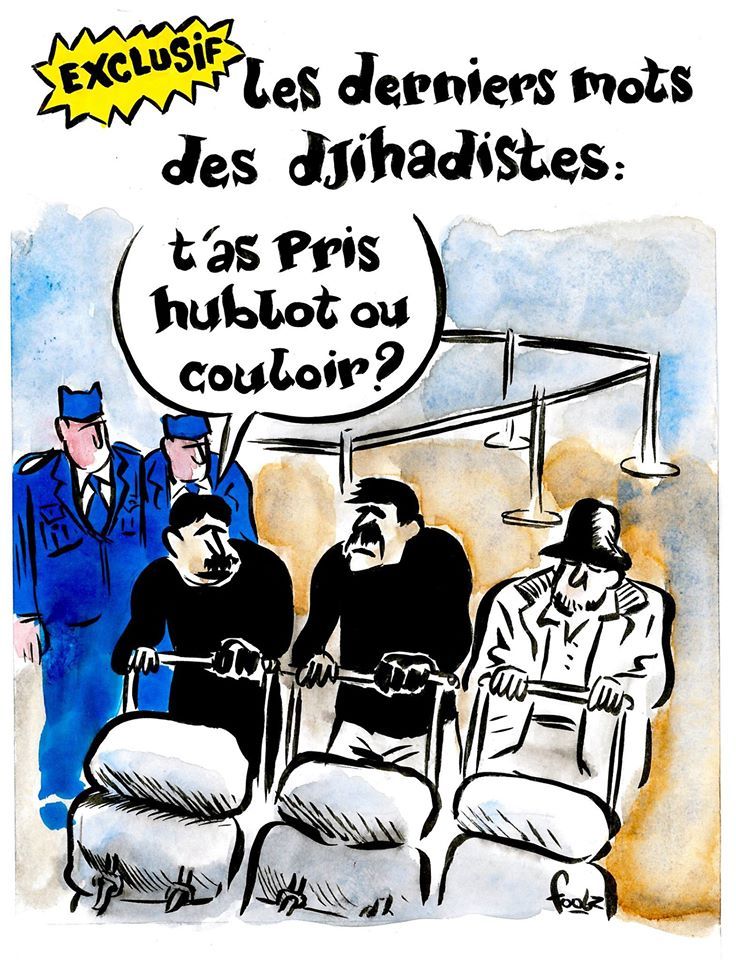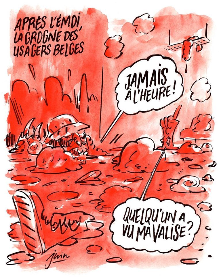 На второй карикатуре изображены кровавые последствия терактов "После волнений, недовольство бельгийских пользователей". На карикатуре есть две подписи - "Всегда не вовремя", "Никто не видел мой чемодан?".