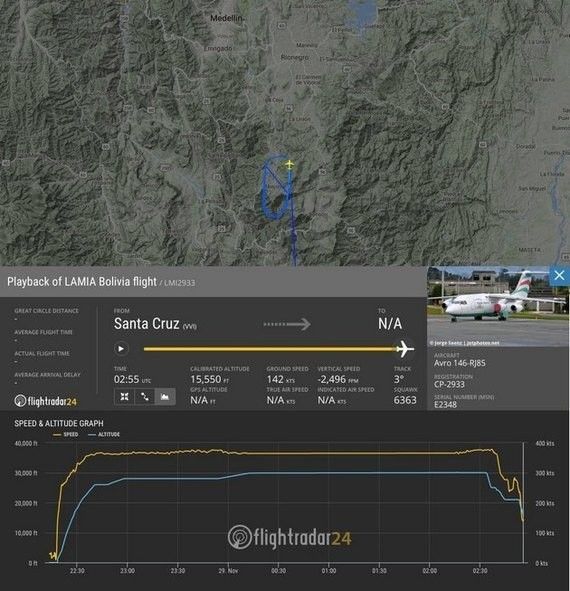 Во вторник, 29 ноября, самолет совершал рейс из Боливии в колумбийский Медельин. Он должен был прибыть в аэропорт города в промежутке между 5:30 и 6 утра по киевскому времени.