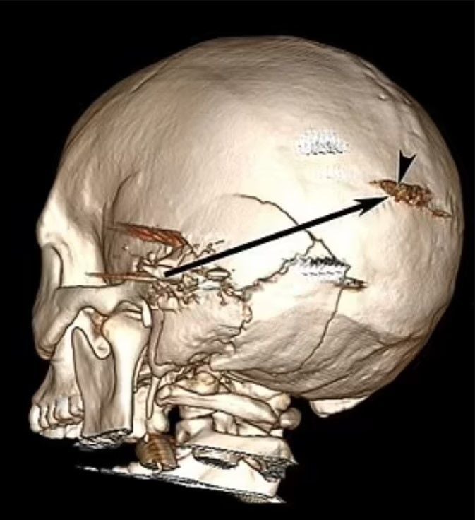 В 29-летнего парня с острова Крит в Греции стреляли из пистолета с расстояния около 10 метров. Пуля раскололась, пройдя сквозь левое полушарие мозга, и застряла в задней части черепа.