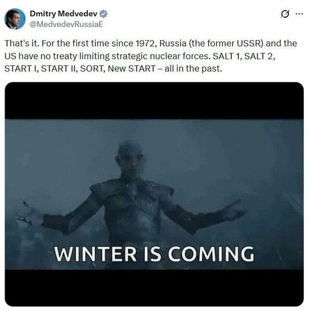 К своему посту Медведев добавил скриншот из телесериала «Игра престолов» с персонажем «Королем ночи», желающим уничтожить мир людей. Также на изображении надпись из сериала — «Зима близко». Вероятно, это должно символизировать «ядерную зиму».