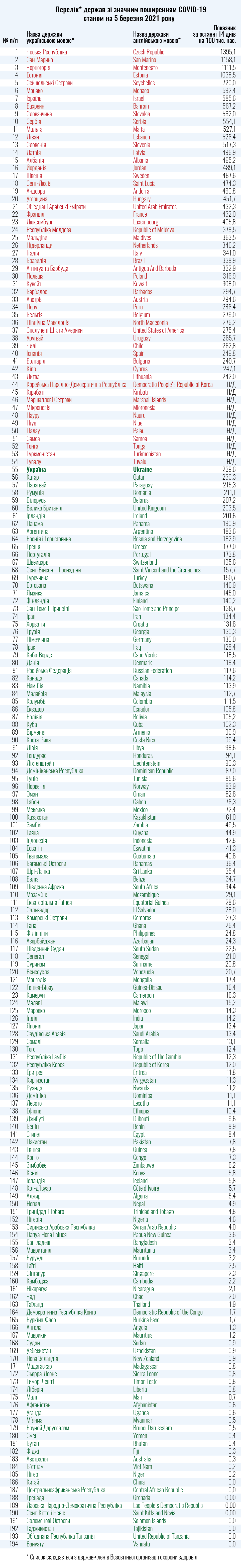 Министерство здоровья Украины 5 марта обновило список стран "красной" и "зеленой" зон с учетом распространения COVID-19. Всего в перечне 194 страны, из них 54 — "красные", а 136 — "зеленые".