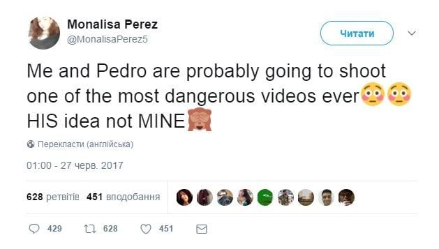 На своей странице в Twitter Перез написала: "Мы с Педро, вероятно, будем снимать одно из самых опасных видео всех времен. Его идея, не моя".