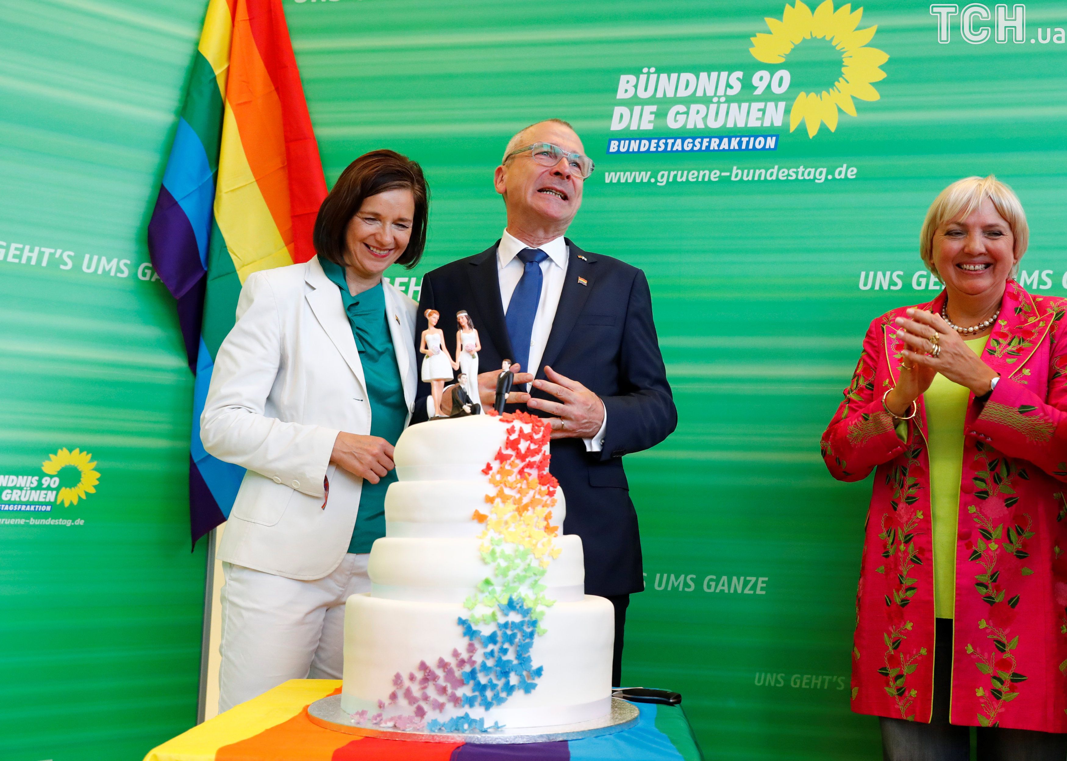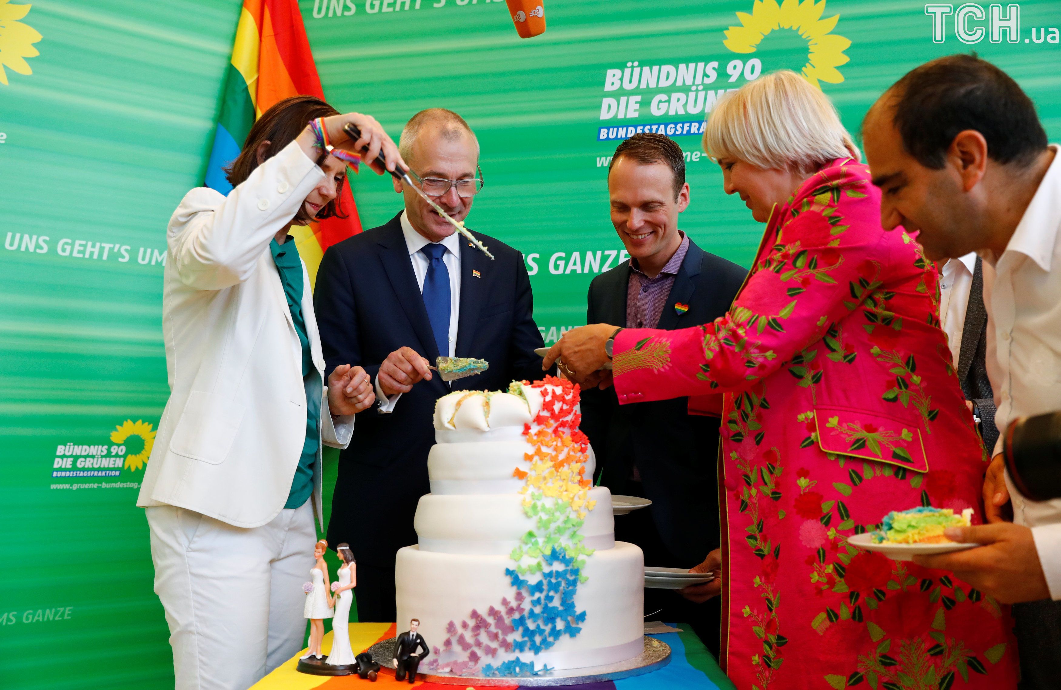 Немецкая политическая партия "Зеленые" отпраздновала решение парламента радужным тортом. / © Reuters