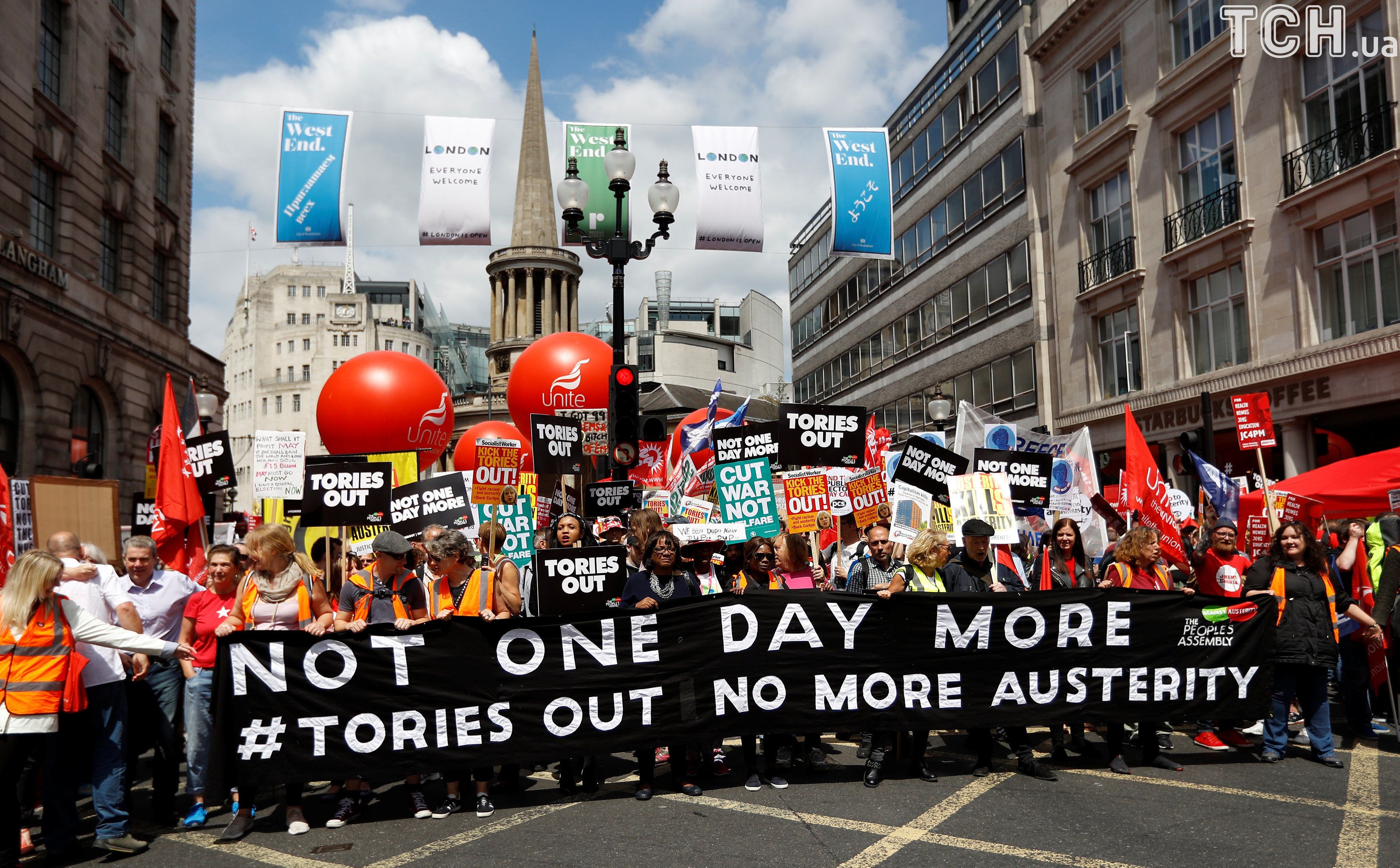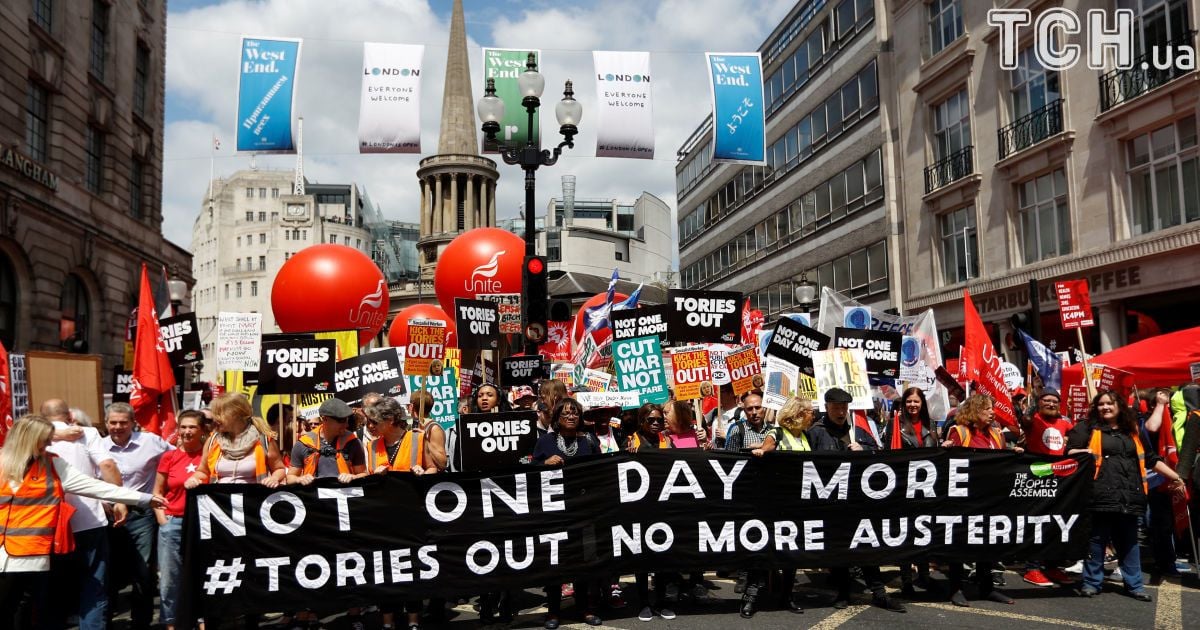 В центральном Лондоне 1 июля тысячи людей вышли на акции протеста, чтобы выразить свое недовольство экономической политикой правительства Британии.