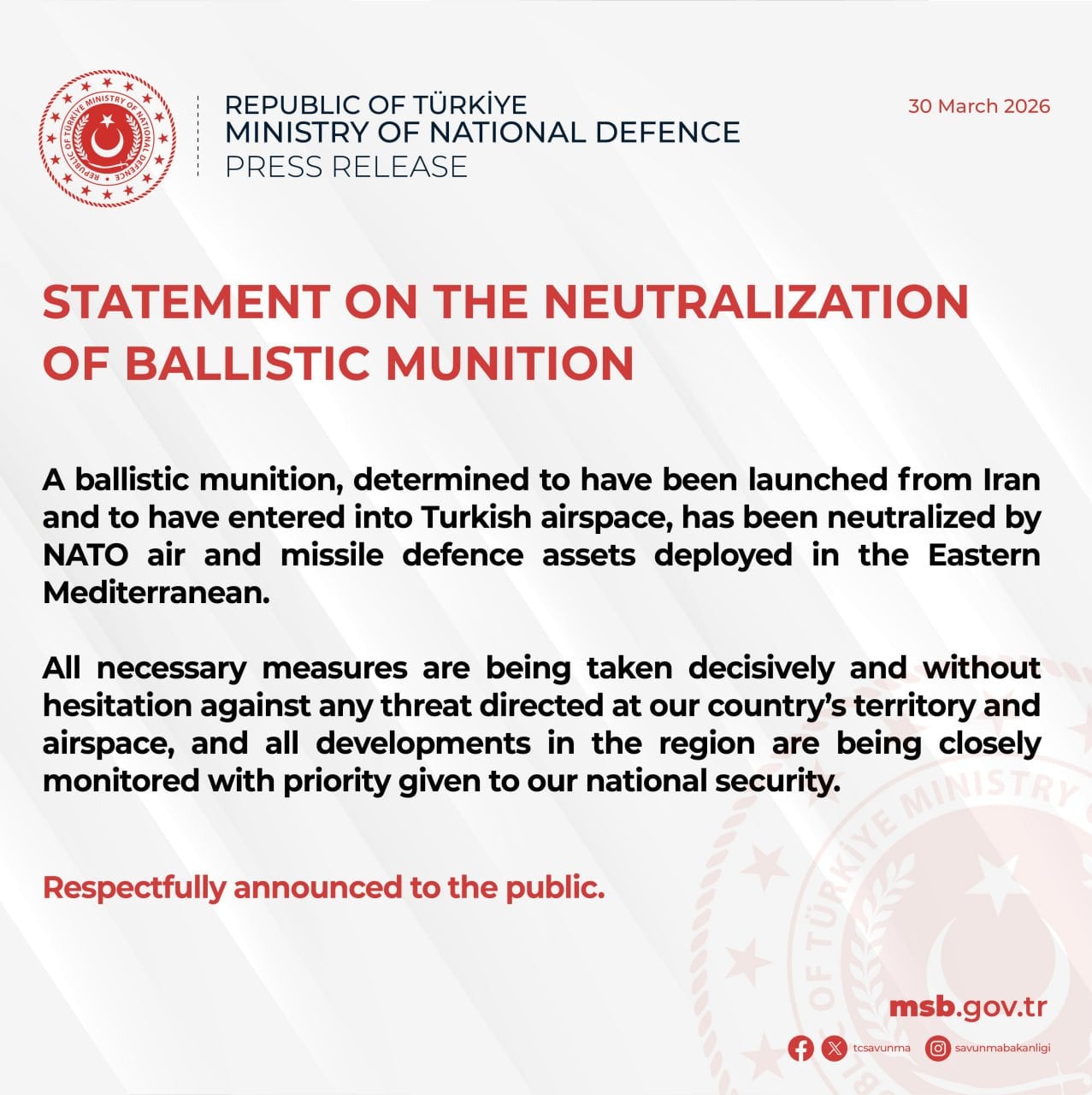 «Решительно и без колебаний принимаются все необходимые меры против любой угрозы, направленной на территорию и воздушное пространство нашей страны, а все происшествия в регионе внимательно отслеживаются с приоритетом нашей национальной безопасности», — говорится в заявлении министерства.