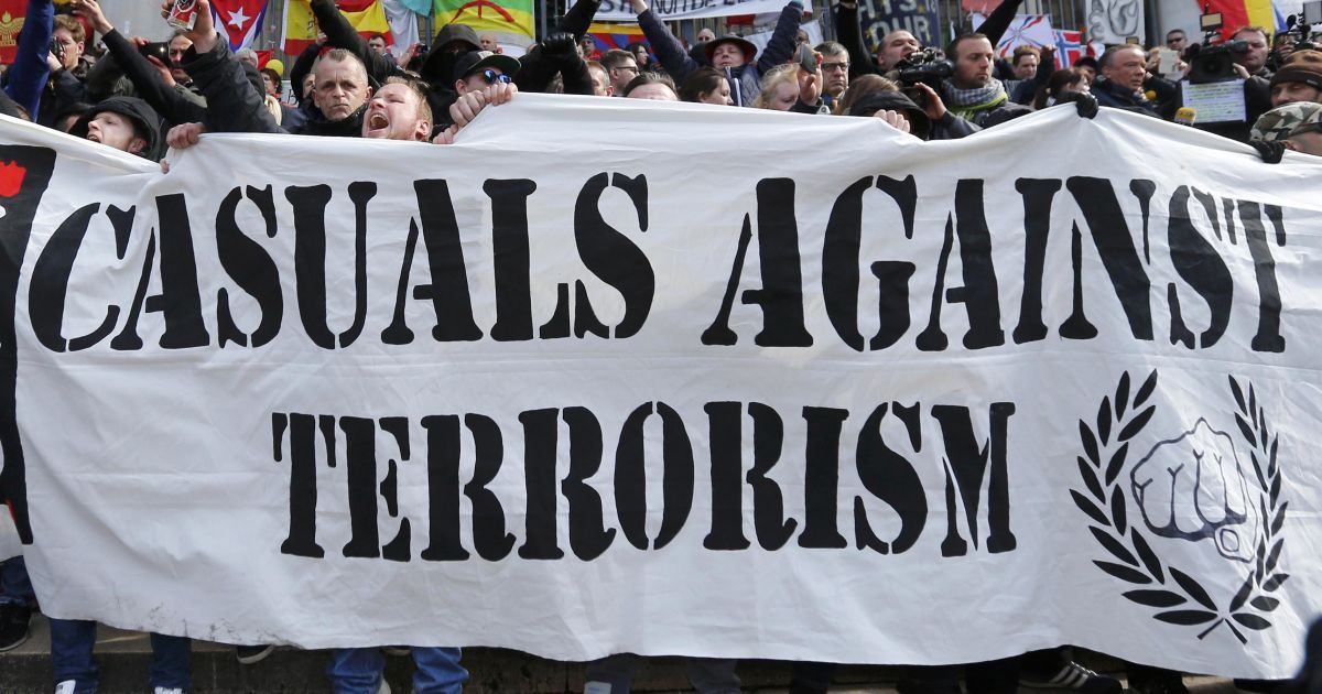 Митингующие, которые представляли группировку "Футбольные хулиганы против терроризма", выкрикивали анти-имигрантские лозунги и спорили с полицией и теми, кто пришел почтить память жертв терактов, передает Euronews.