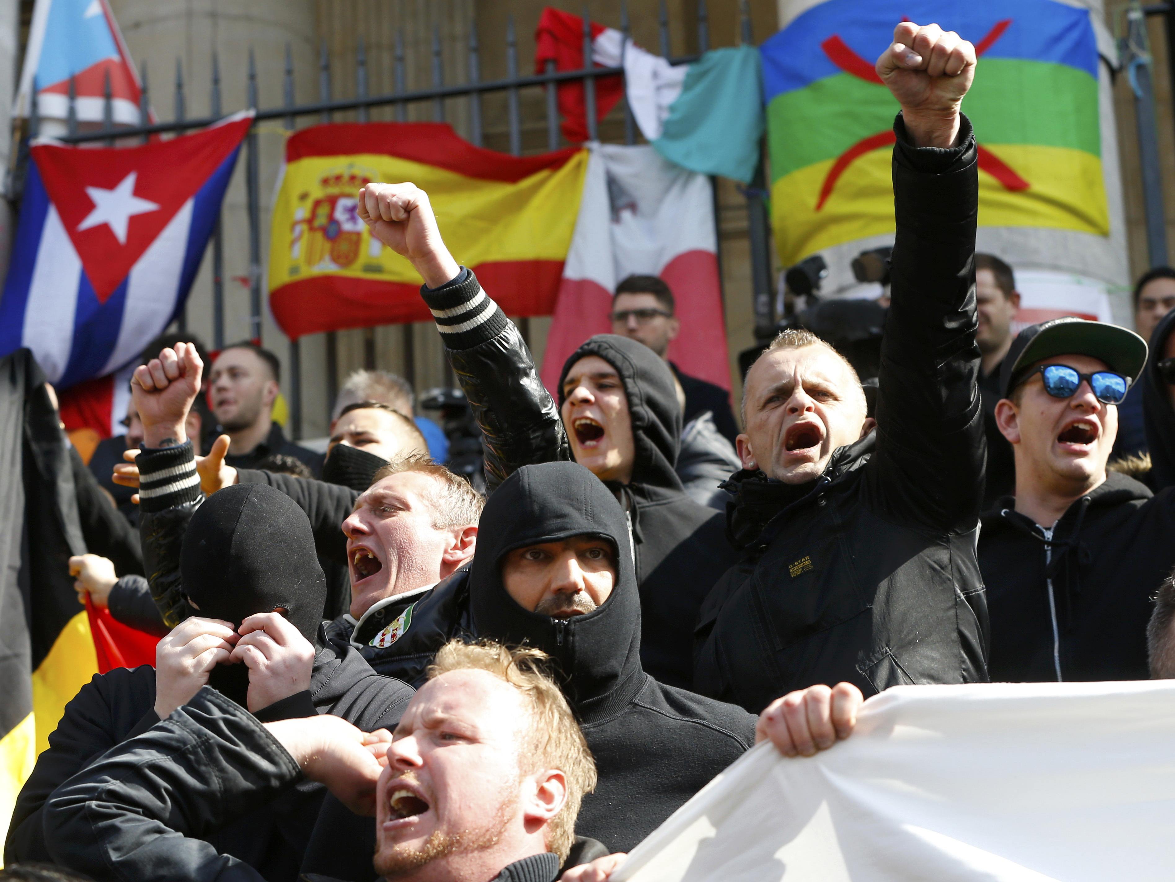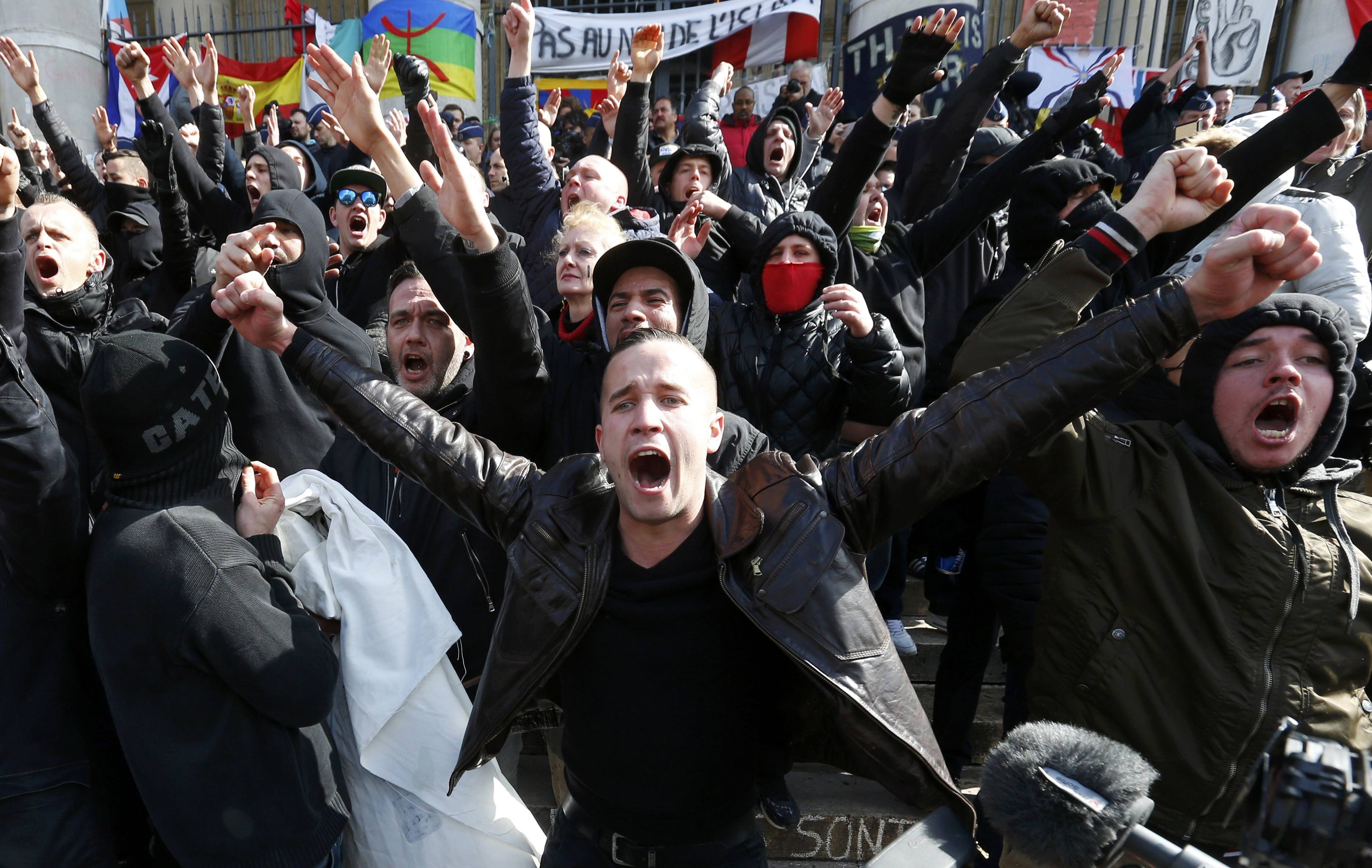 В Брюсселе на площади Биржи, где поминают жертв терактов 22 марта, около 400 ультраправых активистов в черном устроили "Марш против Исламского государства".