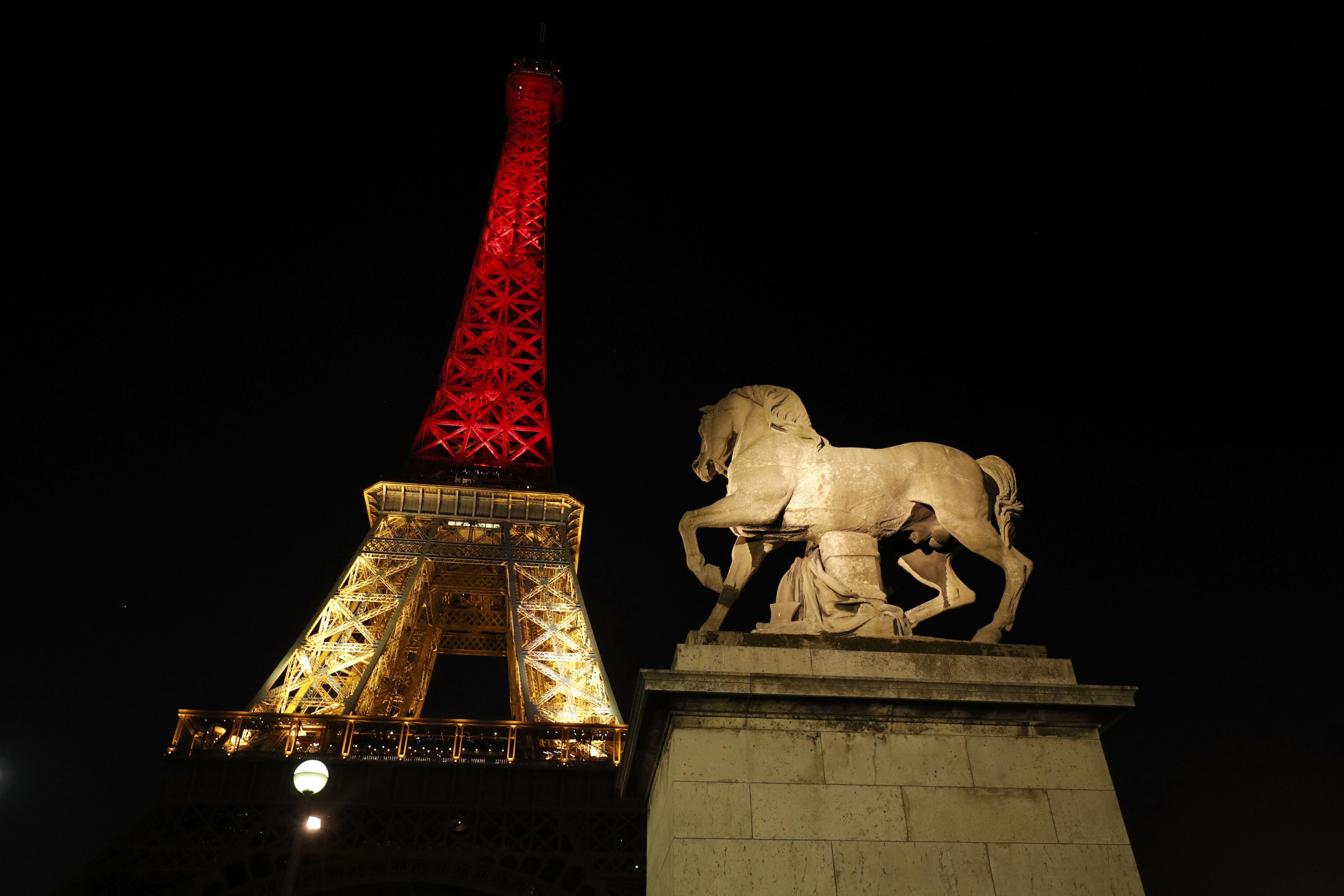 Эйфелева башня в Париже светится цветами бельгийского флага. / © Reuters