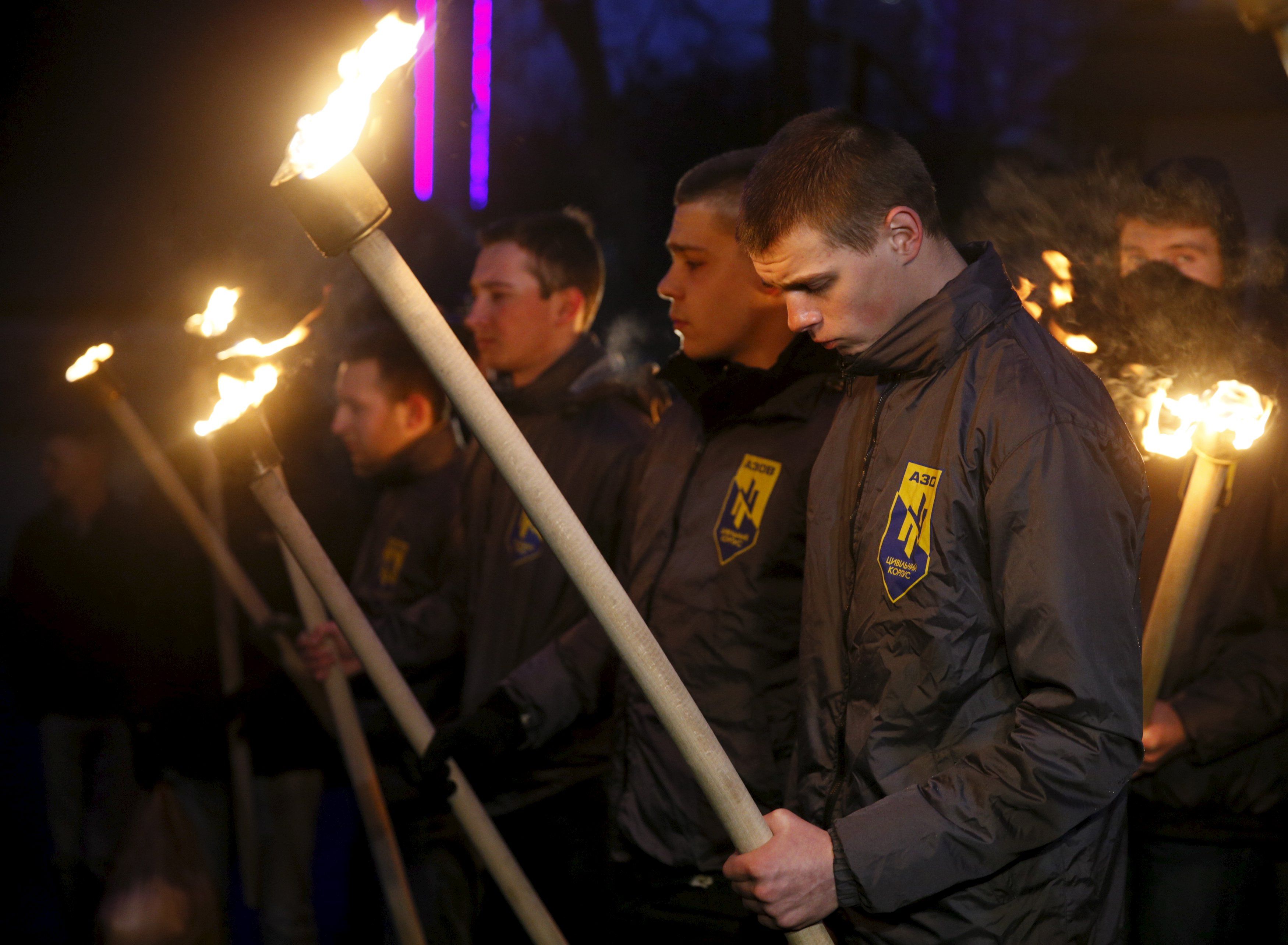 Активисты "Азова" с факелами вспоминают жертв теракта под посольством Бельгии в Киеве. / © Reuters