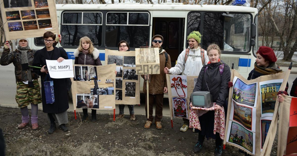 Авторы из России, Украины, Австрии и Финляндии участвуют в передвижной антивоенной выставке под названием {НЕ МИР}. Они собирались пронести свои работы по центру Москвы, а потом выставить их в художественной мастерской.