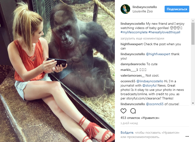 Американка Линдси Костелло опубликовала в собственном Instagram фото с гориллой, которая вместе с девушкой пересматривала видео на ее телефоне.