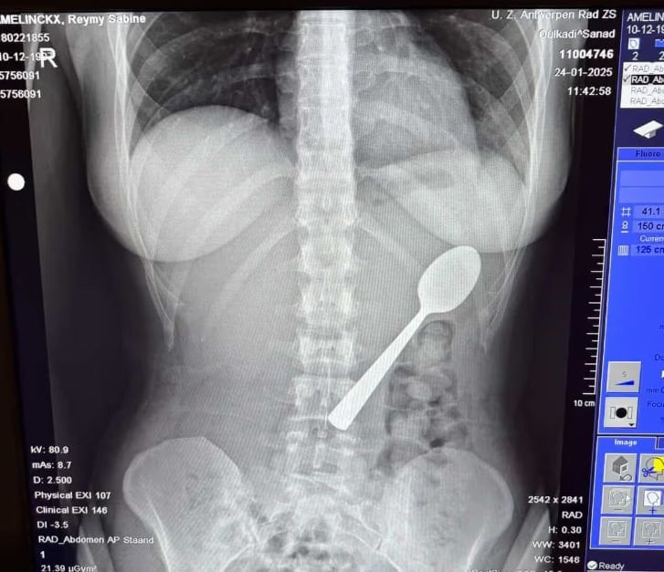 28-летняя бельгийка Рэйми Амелинкс случайно проглотила 17-сантиметровую ложку из-за того, что на нее во время употребления йогурта напрыгнула ее собака. Но девушка сохранила это в секрете, пока не поняла серьезность ситуации.