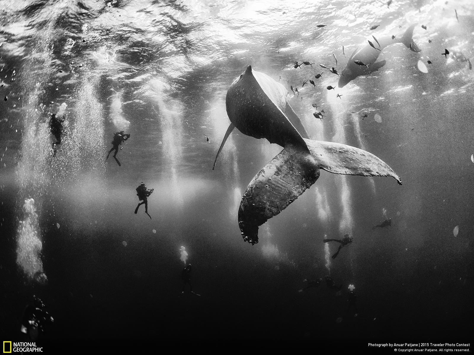 Победителем, по версии National Geographic, стала впечатляющая подводная фотография горбатого кита с малышом в окружении дайверов. Фото сделал мексиканец Ануар Патьянь возле островов Ревилья-Хихедо в Мексике.