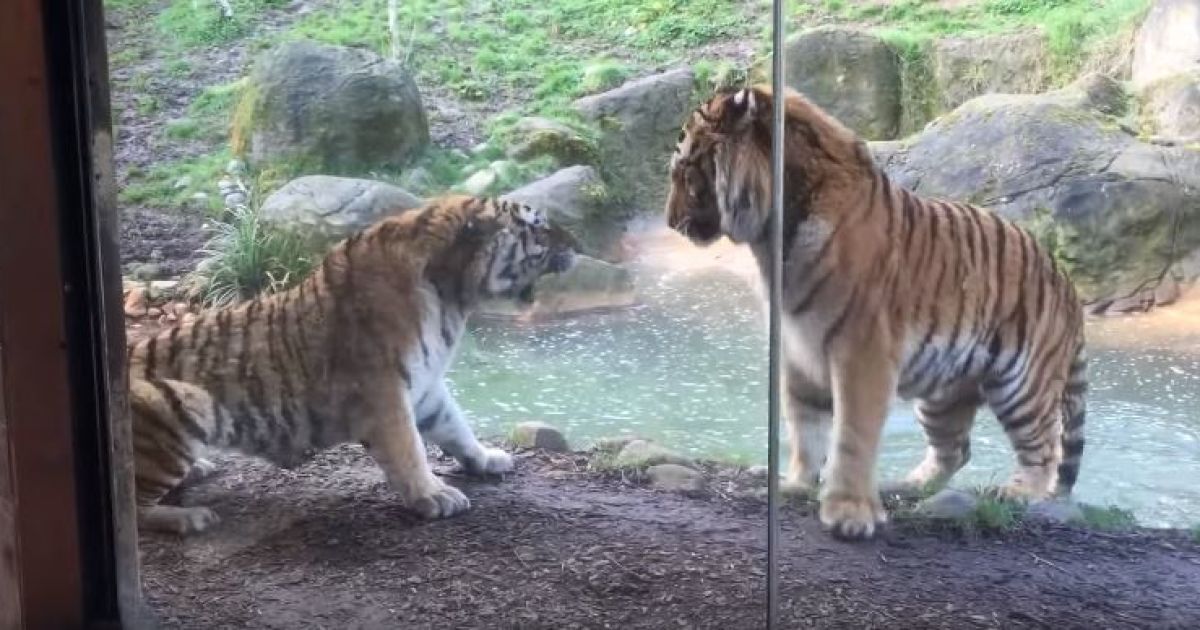 В зоопарке в Дублине посетители стали свидетелями пробуждения тигра. Один из зверей хотел поспать часок после обеда, однако, другому хищнику, вероятно, стало скучно. Поэтому он решил разбудить товарища.