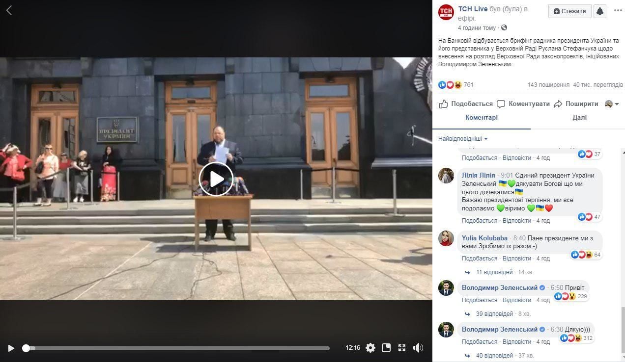 Зеленский появился в комментариях во время онлайн-трансляции ТСН.ua - сообщения в соцсетях он оставляет сам