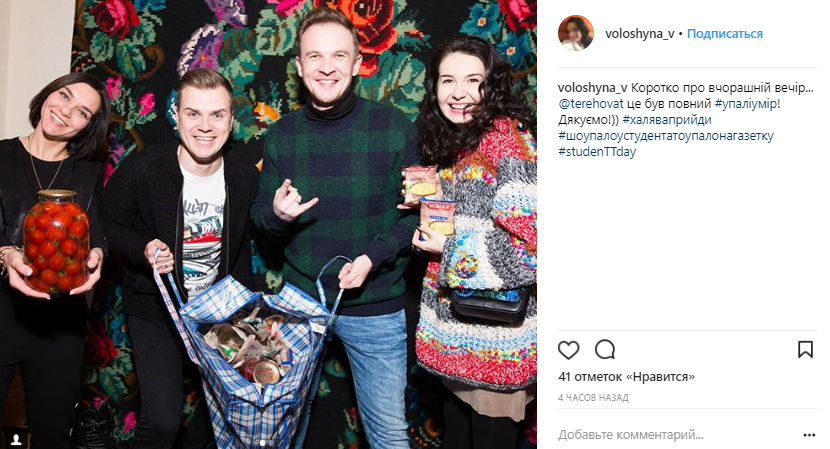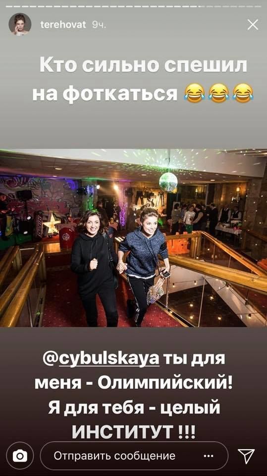 25 января телеведущей исполнилось 26 лет, в субботу, 27 января она вместе с друзьями и коллегами арендовала здание института для "студенческой вечеринки в общежитии". В связи с этим, стол был соответственный: сосиски, консервы, сгущенка, картошка, пельмени и другие блюда. Сама же Терехова и ее гости были одеты в спортивные штаны и шлепанцы с носками.