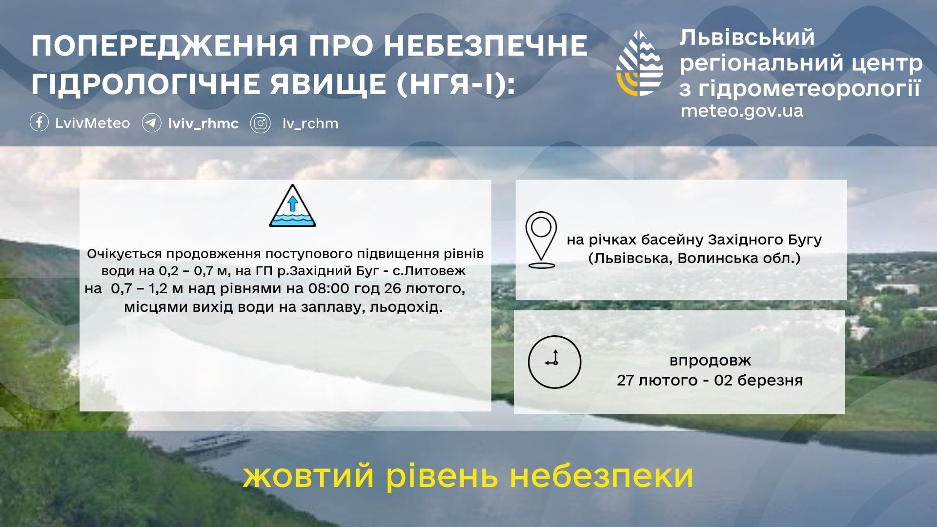 «27 февраля — 02 марта на реках бассейна Западного Буга (Львовская, Волынская области) ожидается продолжение постепенного повышения уровней воды на 0,2 — 0,7 м, на ГП р.Западный Буг — с.Литовеж на 0,7 — 1,2 м над уровнями на 08:00 ч 26 февраля, местами выход воды на пойму, ледоход», — говорится в сообщении.