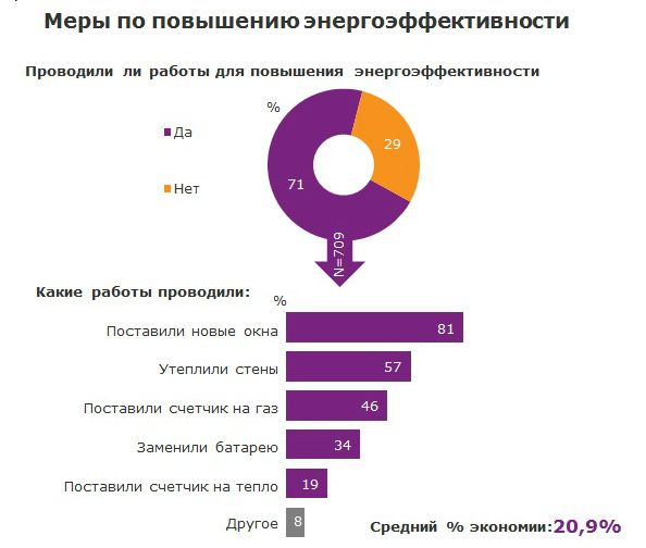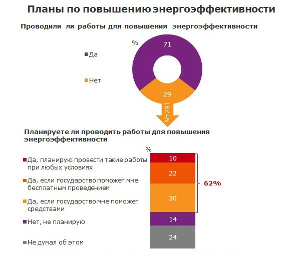 При этом, 2/3 респондентов, которые еще не утеплили жилье, выразили желание провести энергоэффективные мероприятия в будущем. Так, каждый пятый опрошенный отметил, что проведет работы по повышению энергоэффективности в случае бесплатного проведения таких работ, еще 30% отметили, что также повысили бы уровень экономии энергоресурсов, если бы государство предоставило финансовую помощь, 10% отметили, что в любом случае проведут термомодернизацию жилья. И лишь 14% опрошенных ничего не планируют делать для повышения эффективности использования энергоносителей.