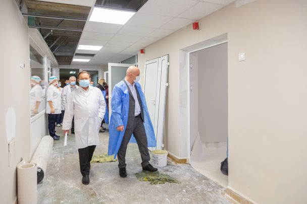 В одной из них, где находятся больные COVID-19, имеющих осложнения сердечно-сосудистых заболеваний, ремонт практически закончен. В другой части реанимации, где ремонт начался месяц назад, работы пока выполнены на 40-45%.