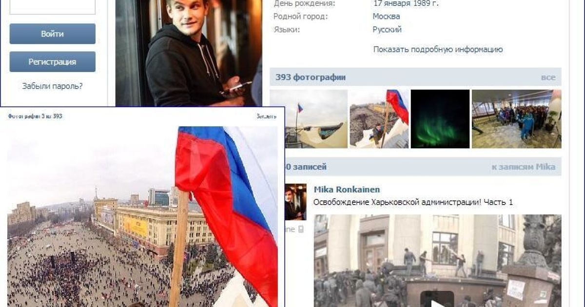 В комментариях указывает, что гордится своим участием в схватках, как он пишет, "с боевиками", а также поднятием триколора над украинским админзданием.