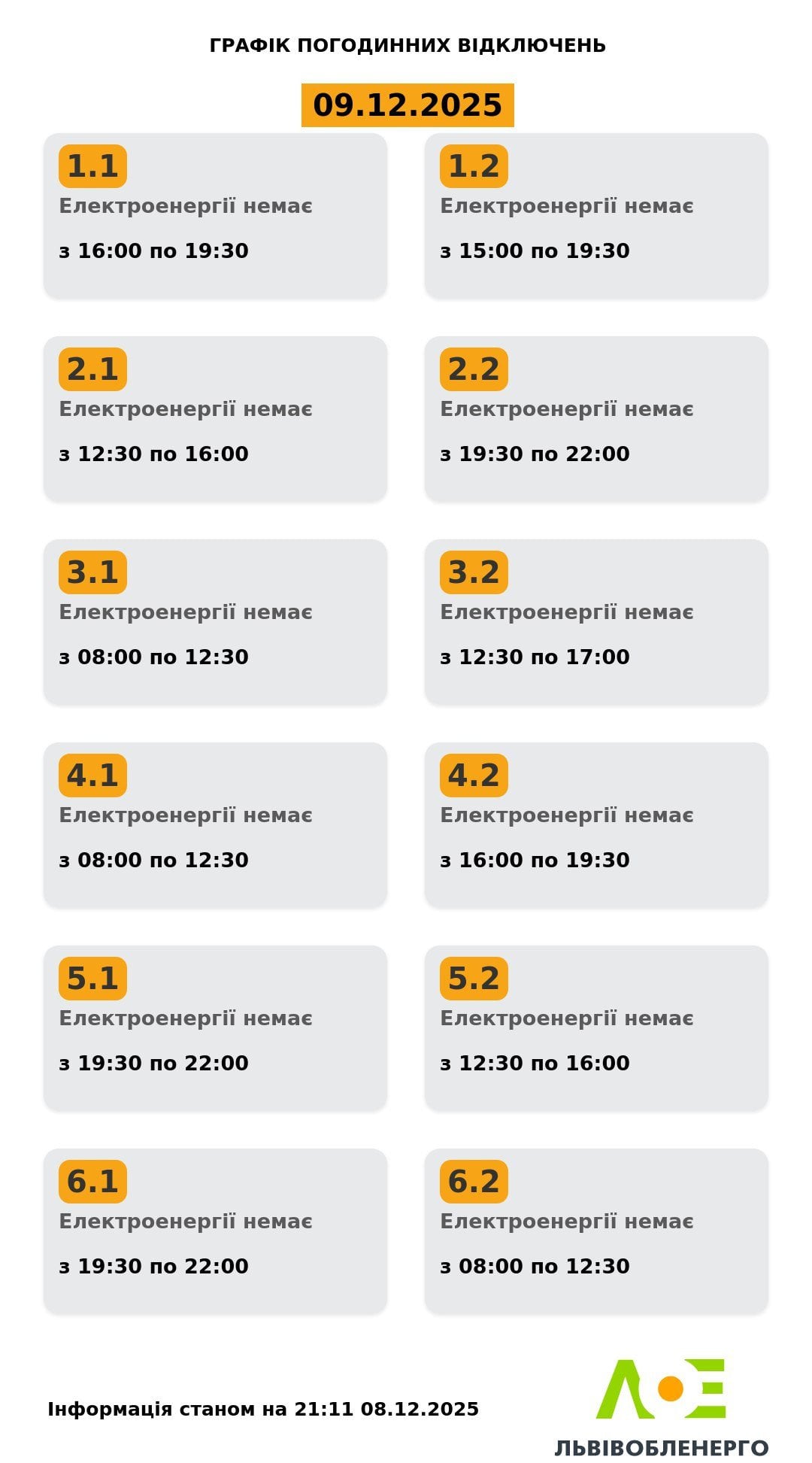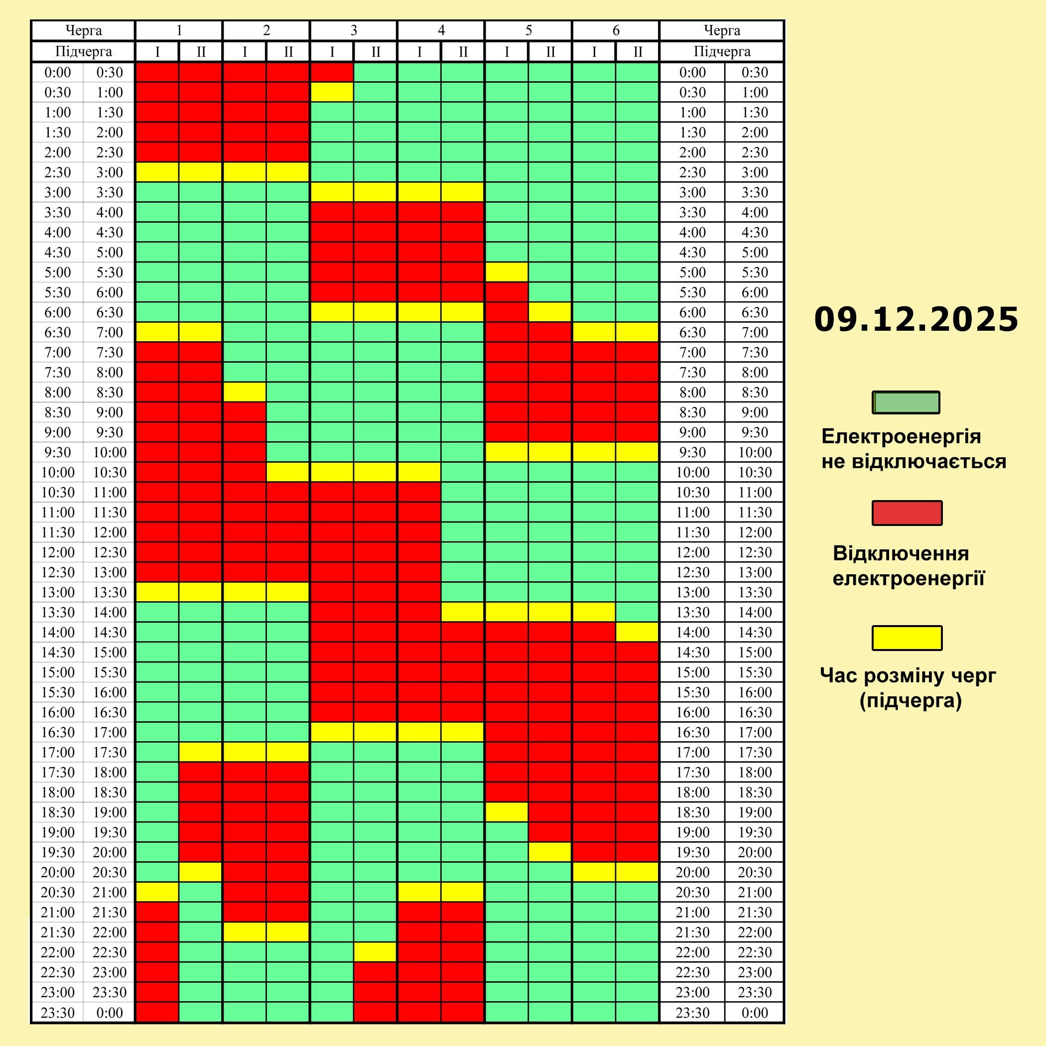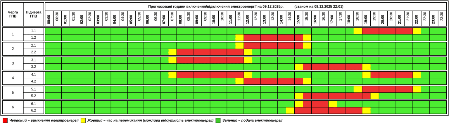 Из-за длительных обстрелов и массированных атак российских войск на энергетическую инфраструктуру Украины, в ряде регионов продолжают применяться графики стабилизационных отключений электроэнергии на 9 декабря.