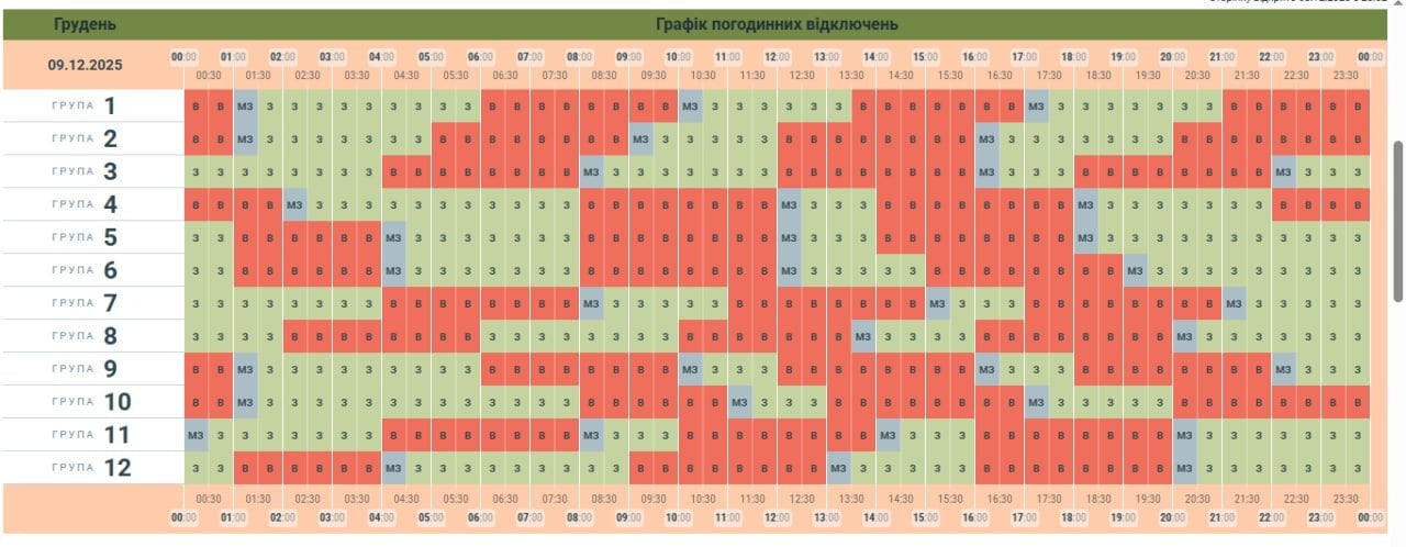 График отключения света в Виннице с 8 по 14 декабря. Фото: Винницаоблэнерго