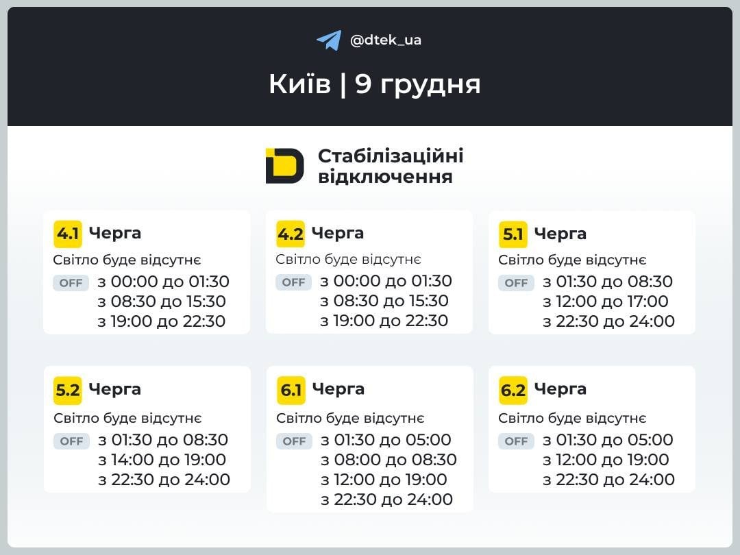 График отключения на Киевщине 9 декабря / © ДТЕК