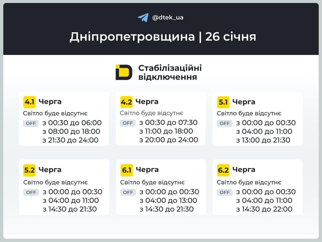 Из-за постоянных вражеских обстрелов и последствий предыдущих массированных атак по всей Украине 26 января будут применяться графики почасовых отключений электроснабжения (ГПО). Потребителям советуют заранее проверять свои очереди и подготовиться к временному отключению света.