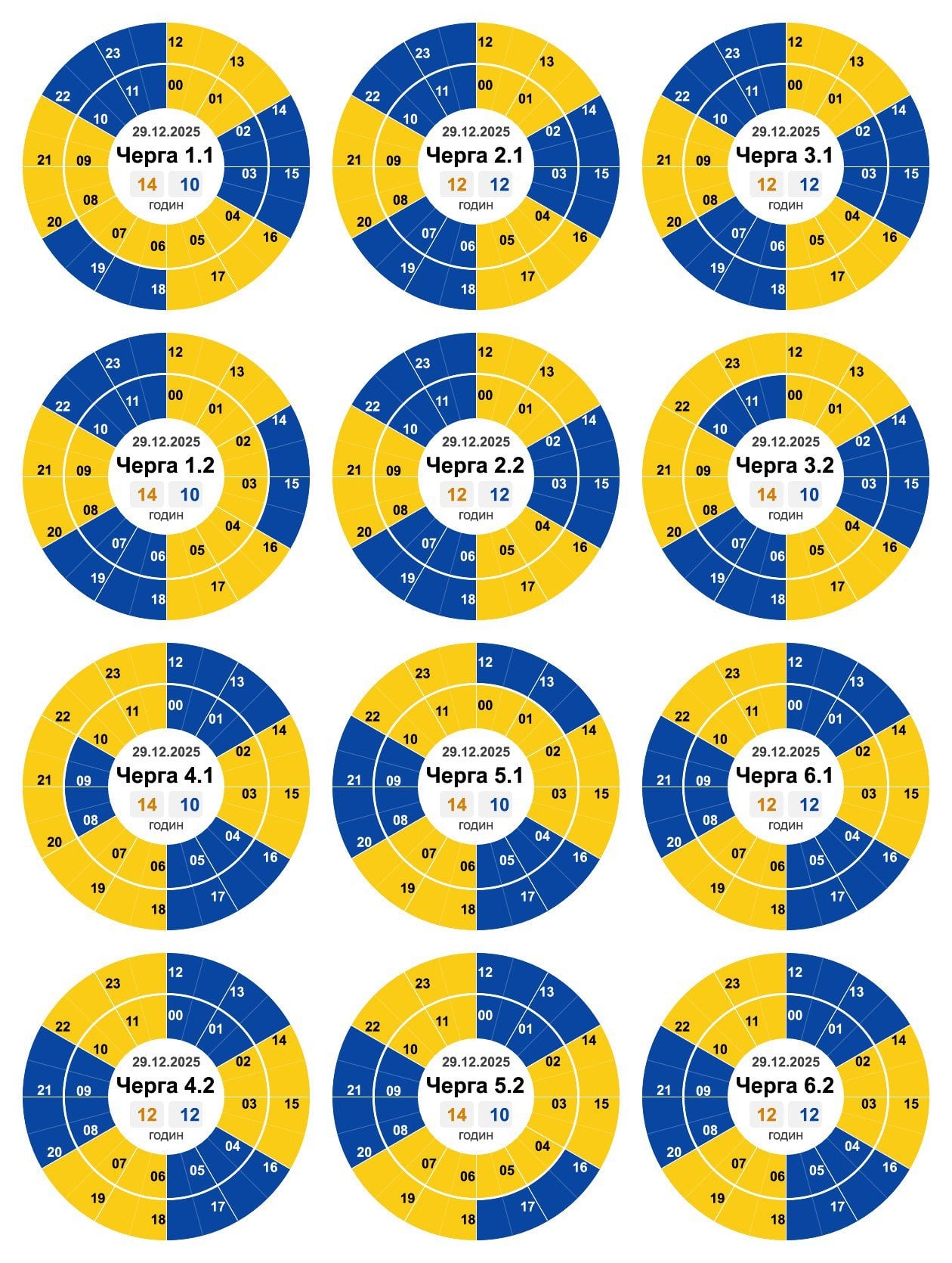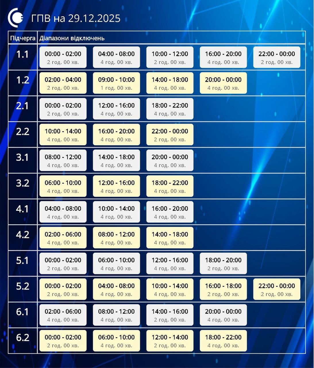 В связи со сложной ситуацией в энергосистеме Украины, 29 декабря 2025 года на Полтавщине введут такие графики отключения: