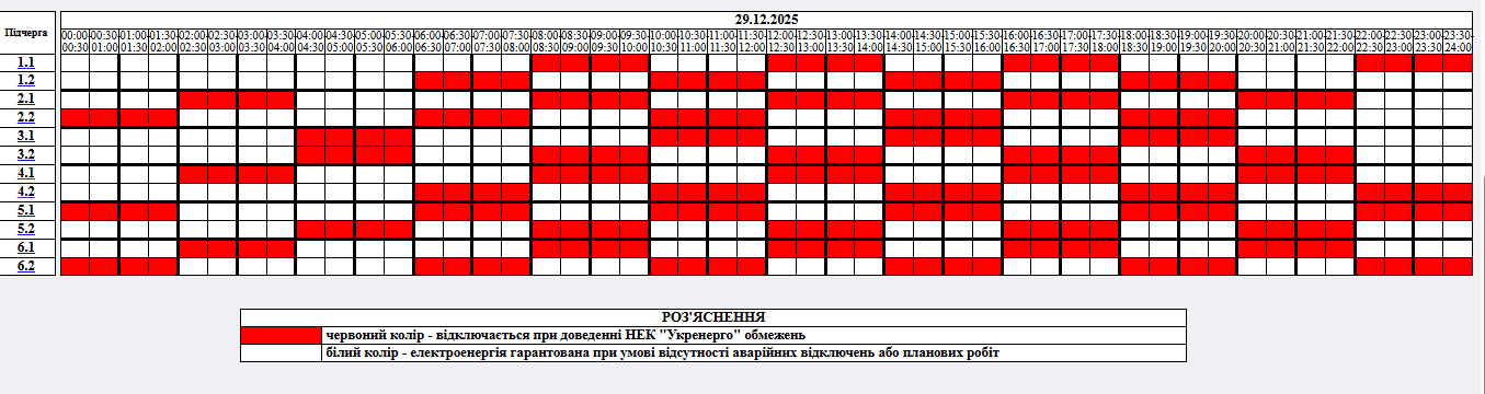 По распоряжению НЭК «Укрэнерго» 29 декабря будет действовать следующий график почасовых отключений:
