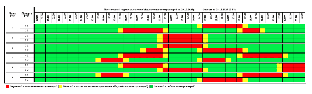 Графики почасовых отключений электроэнергии на 29 декабря выглядит так: