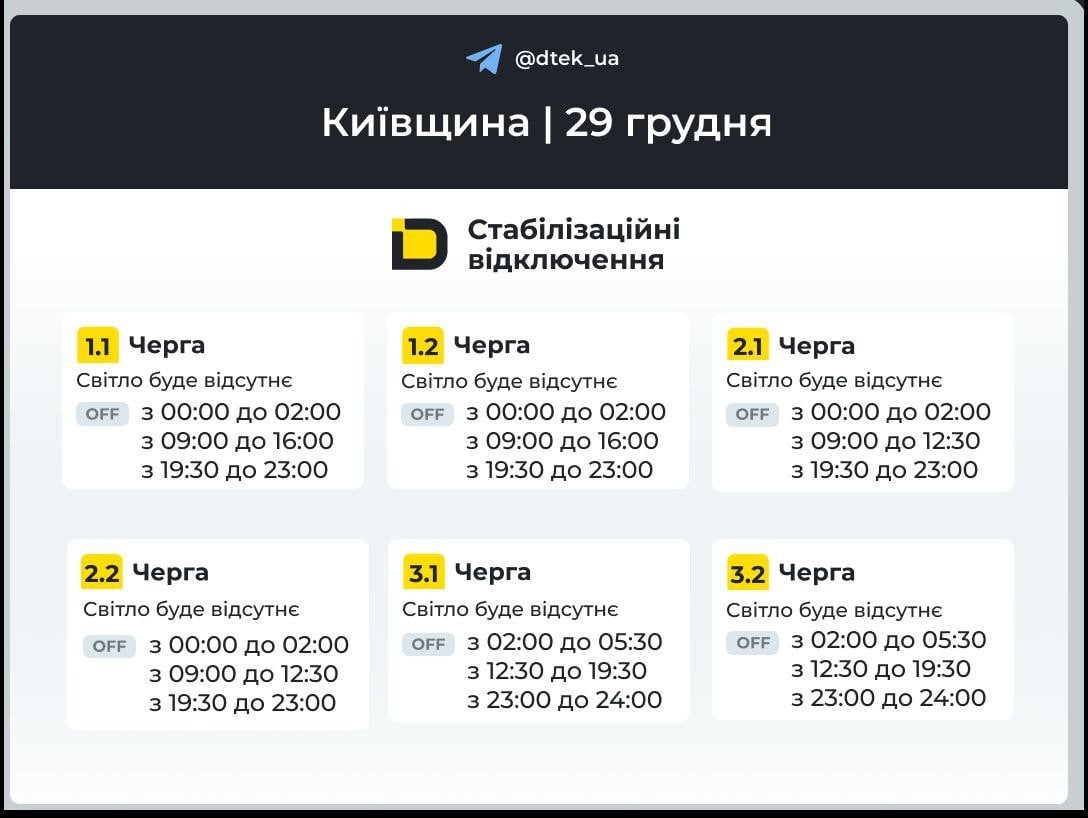 График отключения света в Киевской области на 29 декабря / © ДТЕК
