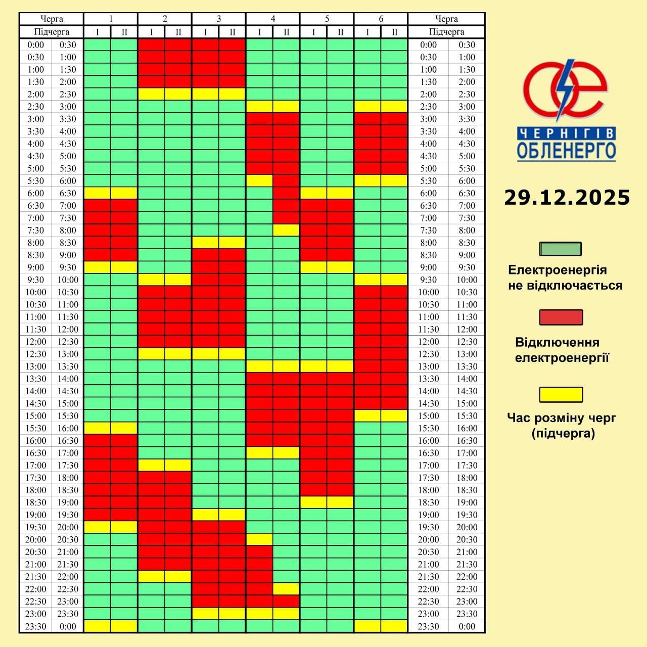 По команде НЭК «Укрэнерго», 29 декабря будет действовать такой график почасовых отключений (ГПВ) в Черниговской области: