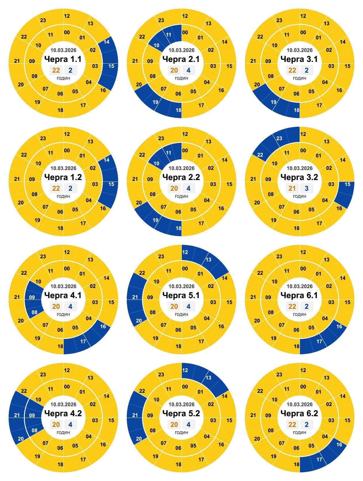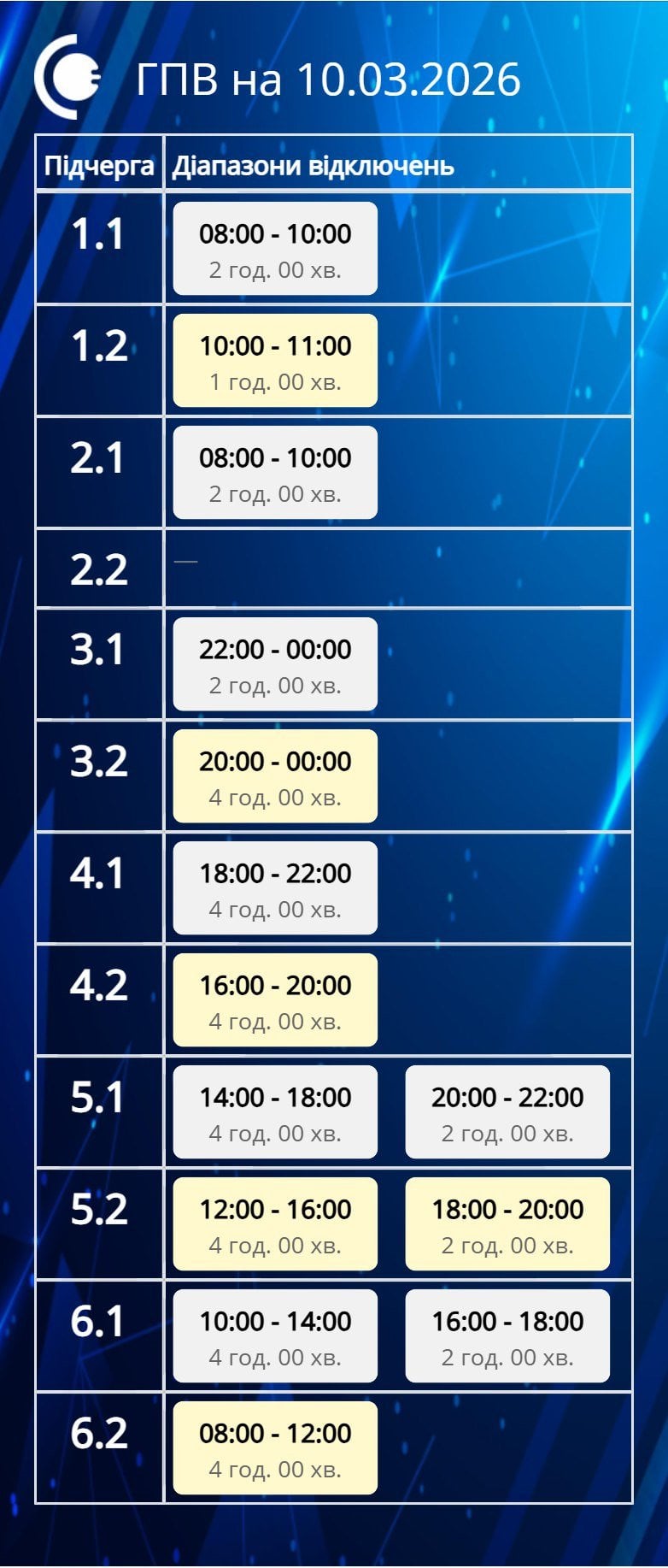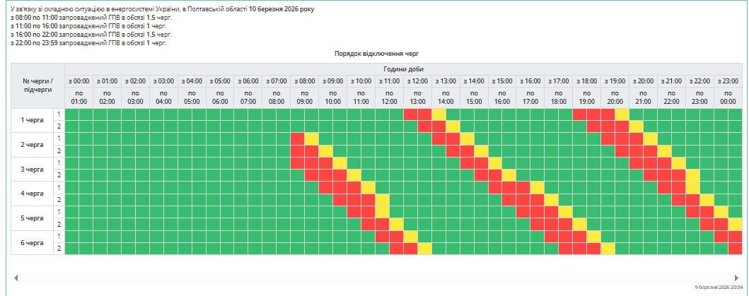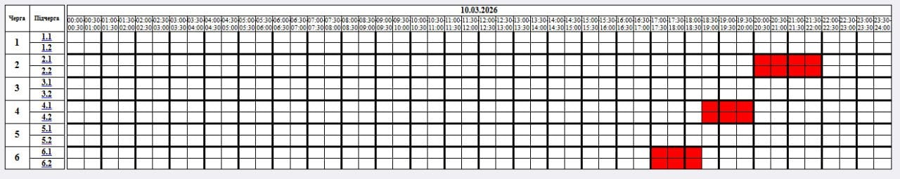 По распоряжению НЭК «Укрэнерго» 10.03.2026 будет действовать следующий график почасовых отключений (ГПО):