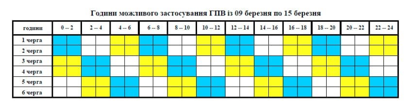 Во вторник, 10 марта по Запорожской области будут применены графики почасовых отключений (ГПО). Часы отсутствия электроснабжения по очередям (подчеркам) (с учетом 30 минут на переключение):