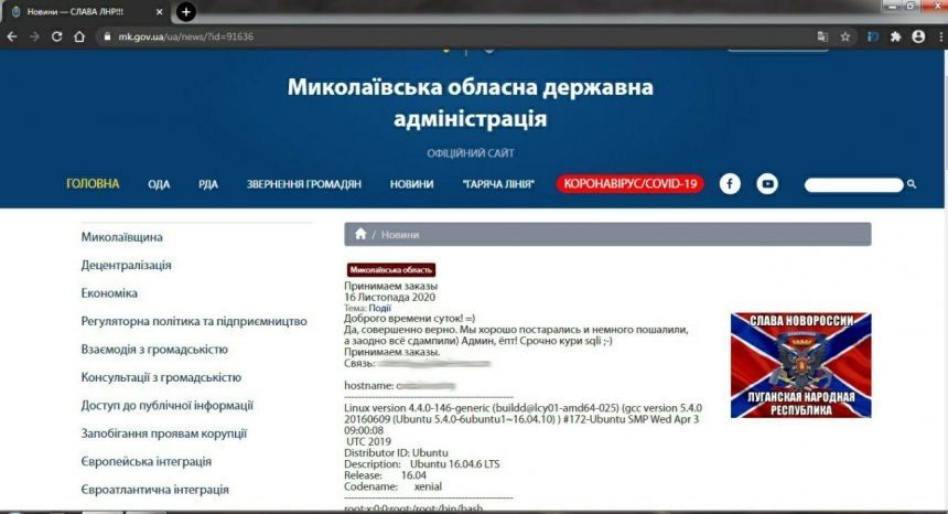 Утром 17 ноября неизвестные хакеры взломали сайт Николаевской областной государственной администрации. Они разместили символику террористической организации "ЛНР" и оставили сообщение.