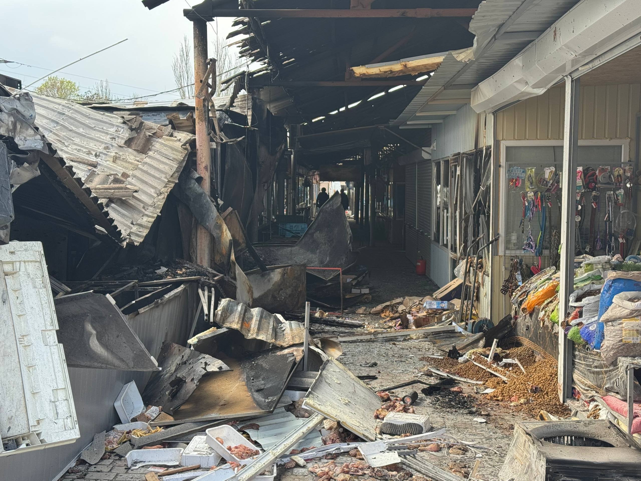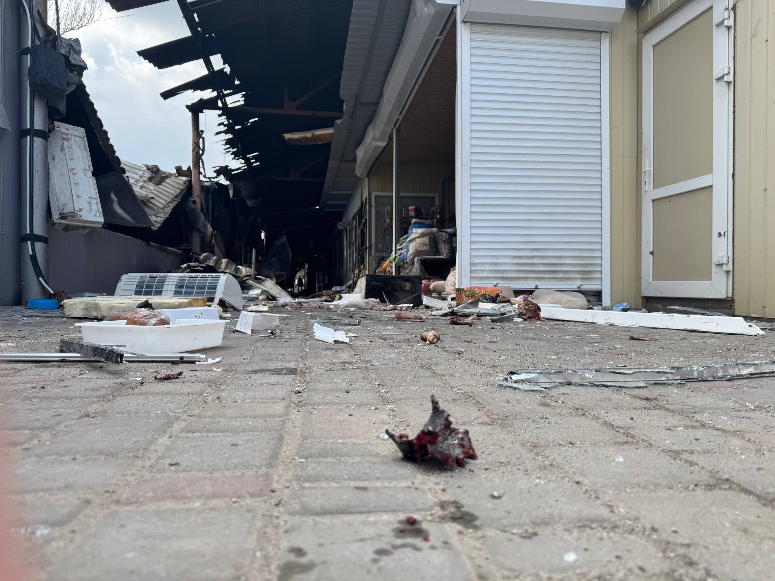 «Здесь продуктовый рынок: овощи, рыбу, мясо, все продавали. Там еще запчасти. Здесь только люди были. Раньше здесь уже было повреждено, избивали артиллерией, немного киосков тогда избили», — говорит он.