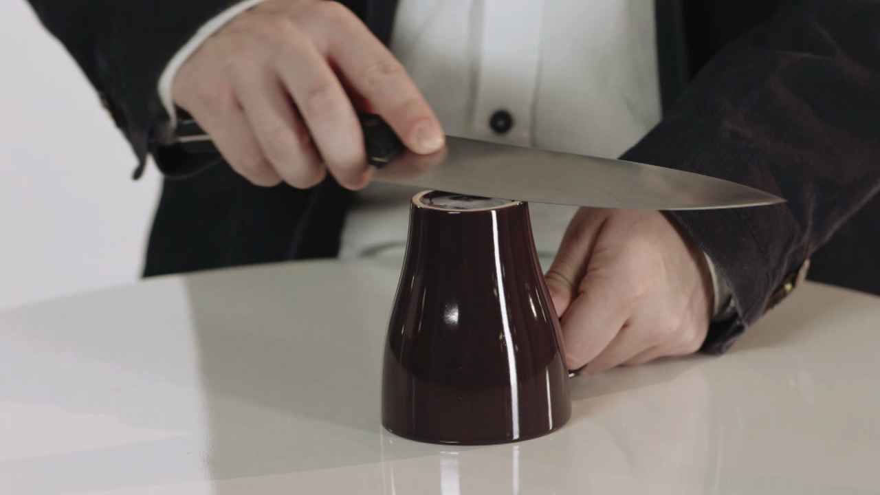 Переверните чашку и используйте выступ донышка чашки, как брусок. Он достаточно жесткий, выжигается при большой температуре, по свойствам напоминает точильный камень. Если нож об него некоторое время поточить, кромка ножа станет острой.