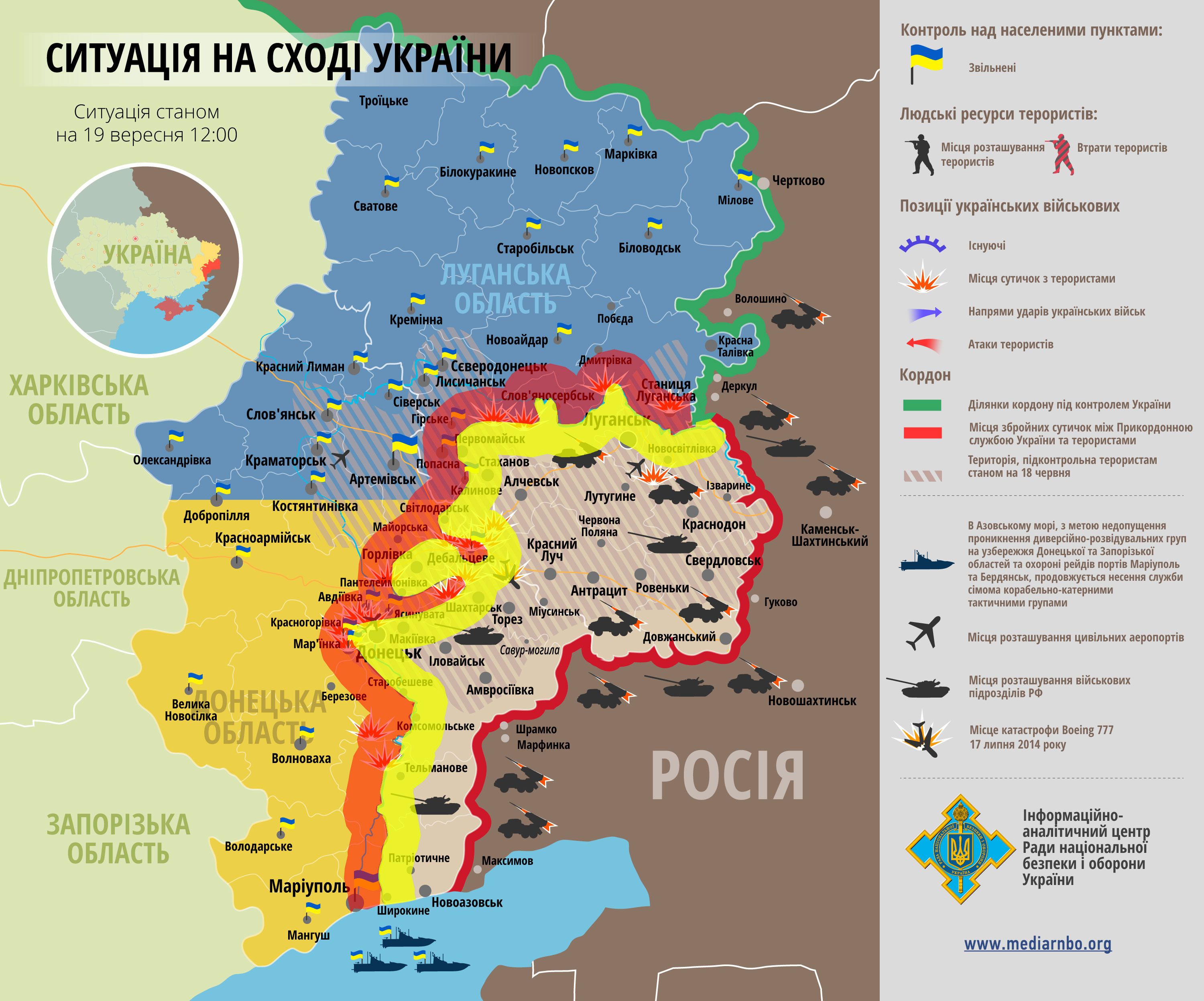 В СНБО уже зафиксировали неспешный отвод техники боевиков за границу буферной зоны, скорее всего, боевики все же планируют выполнить положения Меморандума и перейти к реализации Мирного плана. Но 19 сентября территория, занятая сторонами, по данным СНБО, скорее всего не может удовлетворить боевиков. Особенно в вопросе аэропорту Донецка, о чем красноречиво свидетельствуют непрерывные атаки противника. Также, сложная ситуация остается у Мариуполя, который может превратиться в передовой форпост.