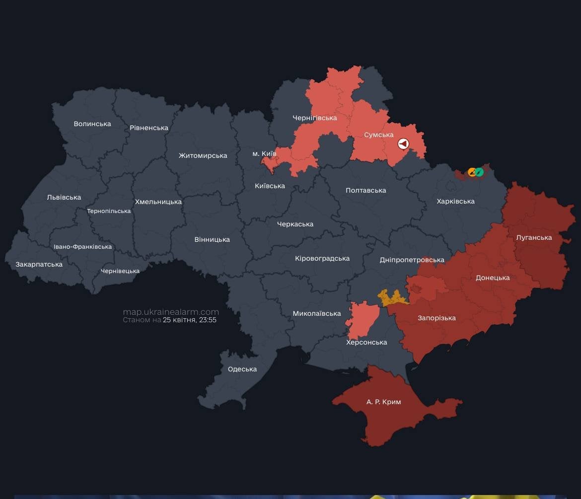 В Киеве и ряде областей Украины 25 апреля раздается воздушная тревога из-за угрозы БпЛА.